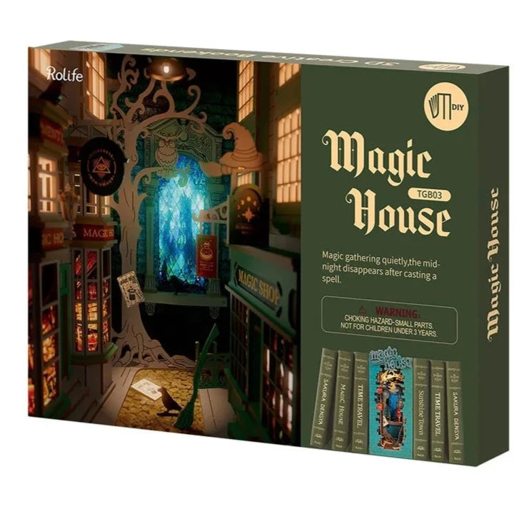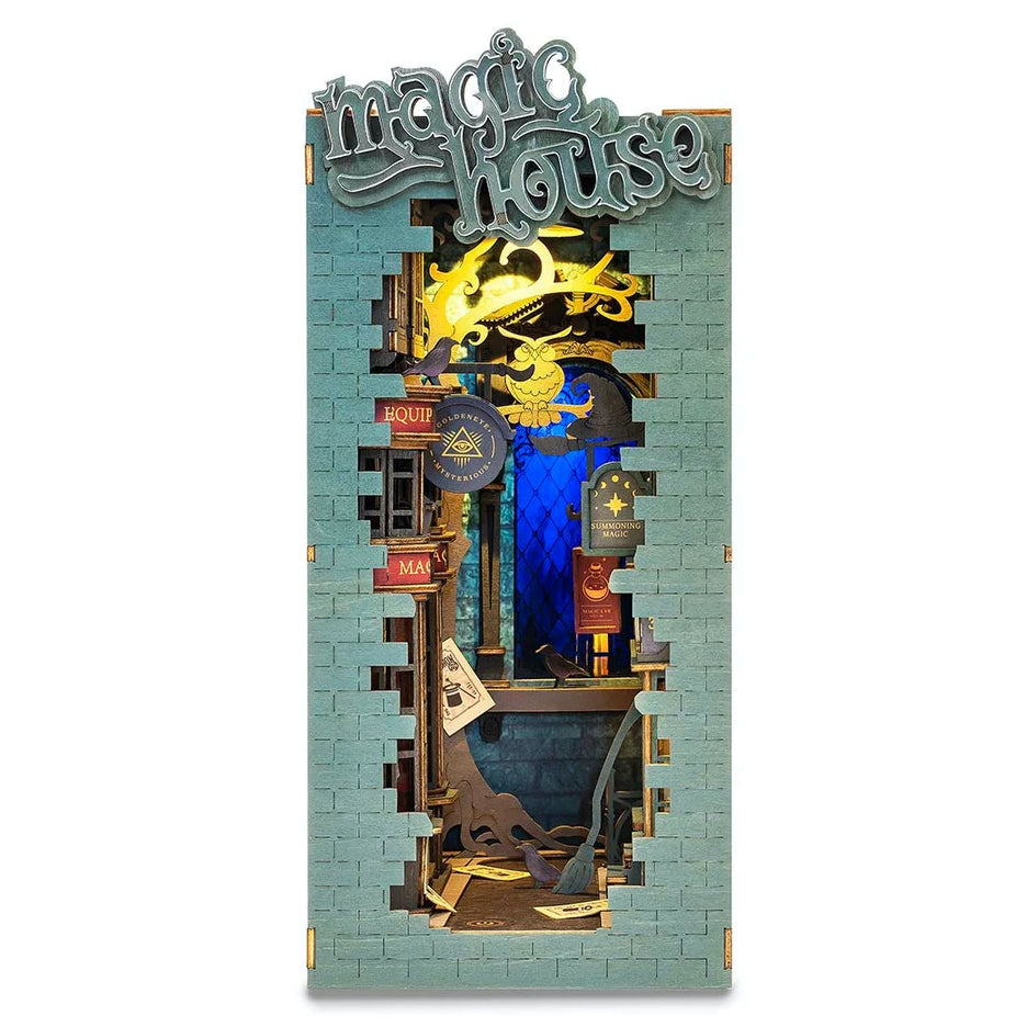 Robotime-Rolife Magic House DIY Book Nook TGB03 DIY miniature house is a mysterious magic alley that only those who can do magic can enter. Here, you can buy all the necessary equipment and essentials for living in the magic world. Now, assemble all the 3D wooden puzzle pieces and build this magic house with your hands. It will be a super cool and unique bookshelf insert & home decoration and will look amazing when you put it in the dark with the warm lights on. It's also a perfect hands-on gift for DIY lovers and magic lovers on birthdays and holidays.