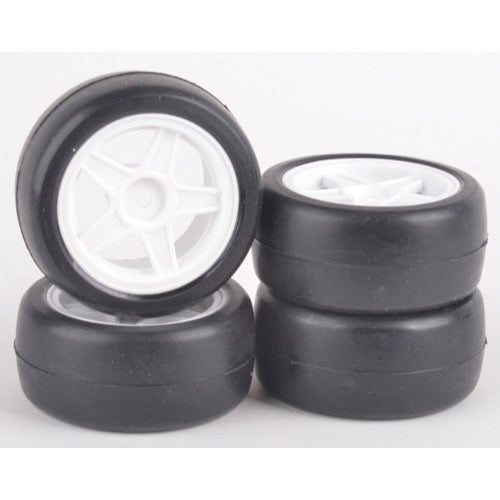 Excellently pre-glued Tamiya mini tyres, new 5 spoke design wheel in 'Flex' material, more grip and less chance of breaking.