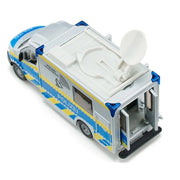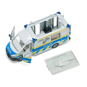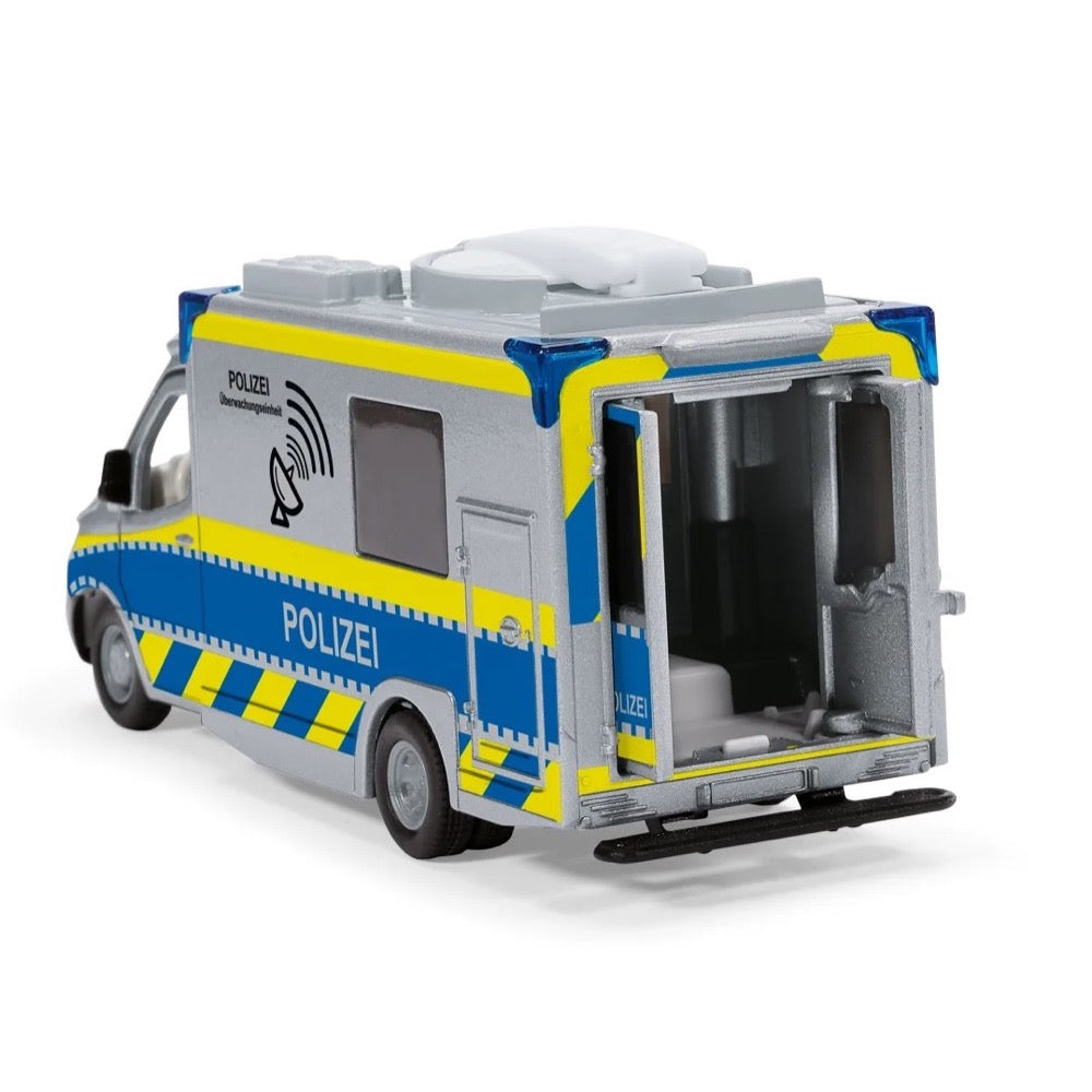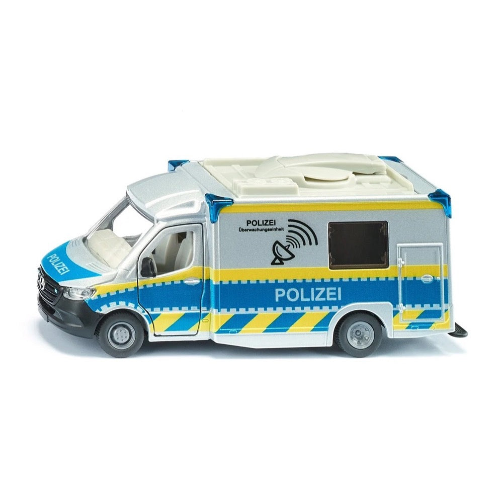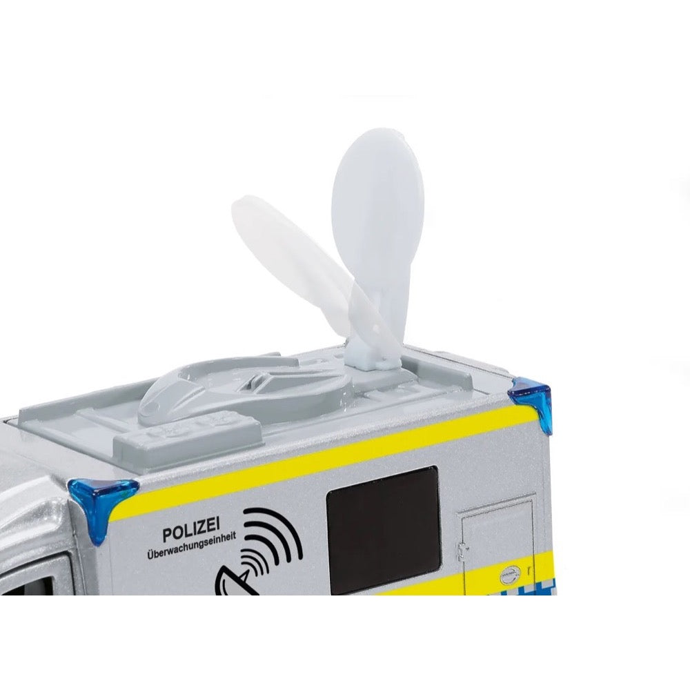 The more complex the police operation, the more important is reliable communication between the task forces. Interaction by satellite communication functions rapidly and smoothly, even in crisis or catastrophe situations. The siku police Sprinter from Mercedes Benz is provided with the appropriate equipment. A rotating satellite dish on its roof can be folded down during travel. The doors on both sides of the driver’s cab can be opened, as can the two doors on the right hand side and at the rear. The corners of the box body are marked by four blue lights. The typical silver/blue colouring of the Police Sprinter is complemented by all-round yellow signal marking, as well as “Polizei” and “Polizei Überwachungseinheit” lettering.