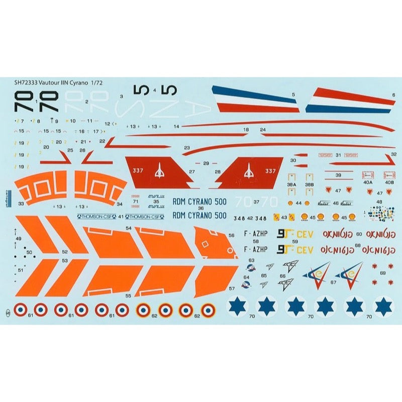The model comes on four sprues of plastic part components, and comprises also a clear parts sprue, a PE-parts fret and detailed resin parts which offer the modeller with a Cyrano radar nose section, external fuel tanks and several other parts typical for this highly interesting and unusual Vautour test-bed and ECM variant. The decal sheet was printed by Italian Cartograf in exquisite quality and supplies markings for two French planes, No 348 in natural metal finish, the other, No 337 featuring French national colours overall. There are of course also markings for the Israeli "Fantomas" named machine, this one interesting also for carrying two different liveries, the earlier being also the NMF, the other in the standard Israeli three-tone upper camouflage colour scheme.