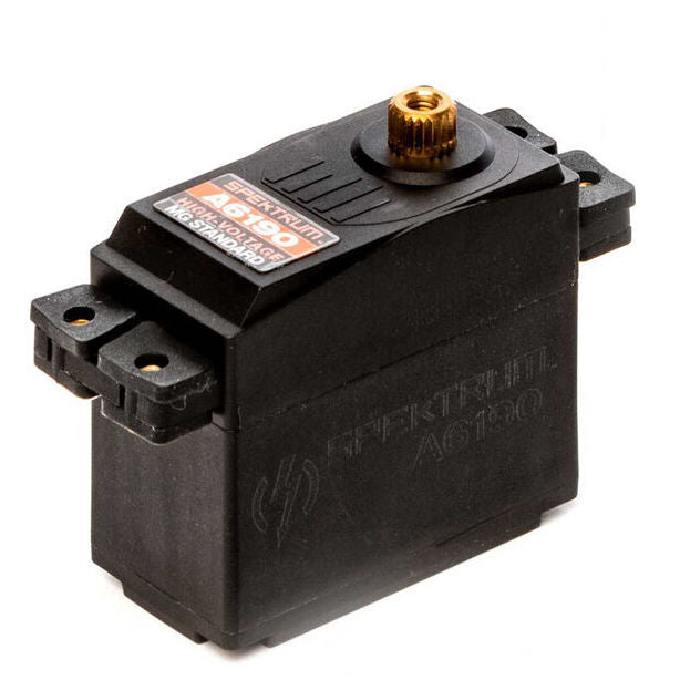 The Spektrum A6190 Metal Gear High Voltage Digital servo offers impressive performance for pilots looking for an excellent value standard size servo for their Sport and Trainer aircraft. High voltage capable, the A6190 can produce 8.3kg-cm (115 in-oz) of torque at 0.17 sec/60° speeds with 8.4V input. Its low-wear, metal gear drive train is powered by a 5-pole ferrite motor and is supported by dual ball bearings for smooth operation. It also features low deadband and precise position control. Like all Spektrum servos, the A6190 delivers reliability, consistency and performance that are second to none.