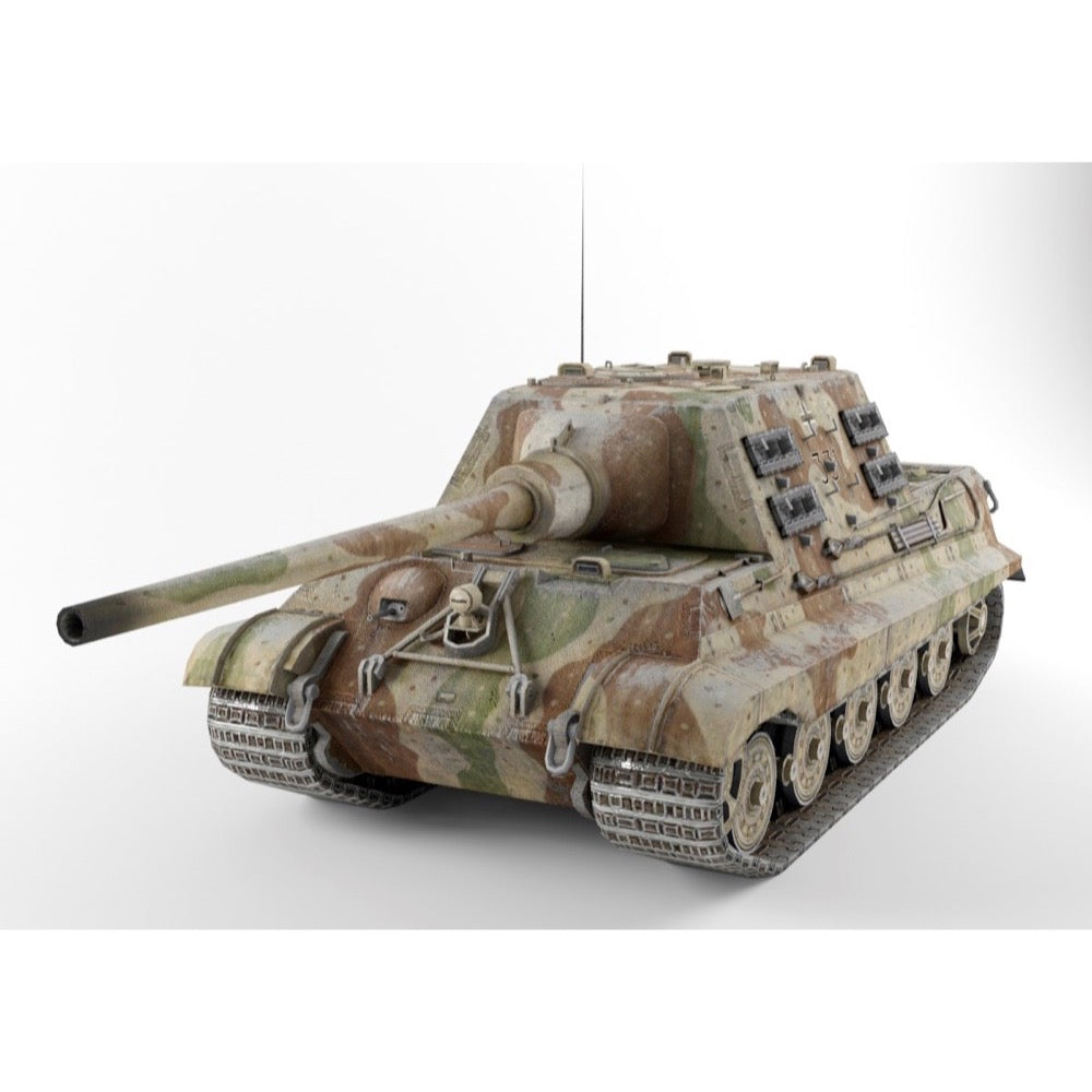 The Jagdtiger is a German heavy tank destroyer developed in the latter half of World War II. This model kit from Takom can be built as a vehicle that was to have been manufactured with the same 71-caliber 88mm tank gun as the Jagdpanther, or a 66-caliber 128mm anti-tank gun that was a longer version of the 55-caliber 128mm gun mounted on the Jagdtiger. The kit can be built with the main hatch opened or closed; the tracks are link-and-length type. Photo-etched parts, decals for four versions, and a metal 128mm PaK L66 gun barrel are included.