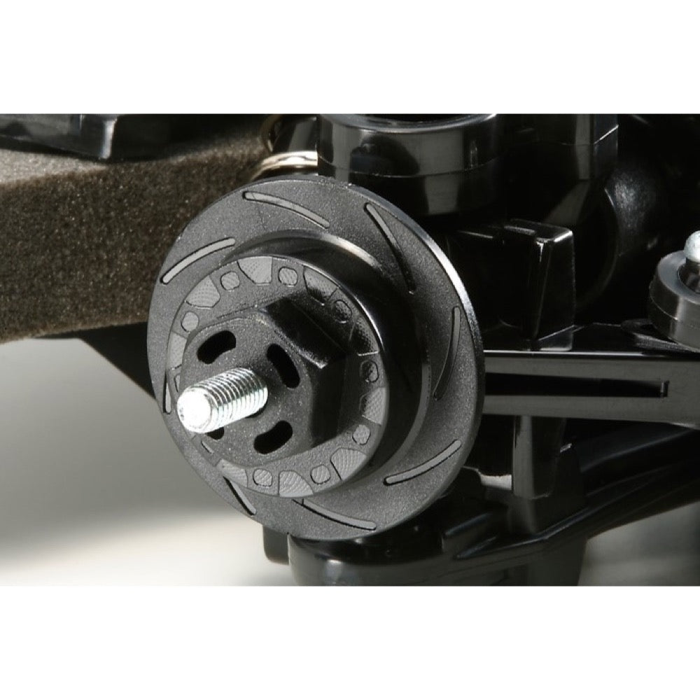 The shaft driven 4WD TT-02 chassis employs a longitudinal layout with the battery on the left and the motor on the right, to offer excellent stability. In addition, it features identical left and right suspension arms and uprights for ease of assembly, plus easy-to-maintain gearboxes. It is a highly adaptable chassis, as it offers 2 different wheelbases, 2 ground clearance settings and 2 tread set-ups in addition to a range of 10 possible gear ratios. It is not short on looks either, with brake disc-shaped wheel hubs and stylish front bumper supports.