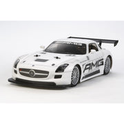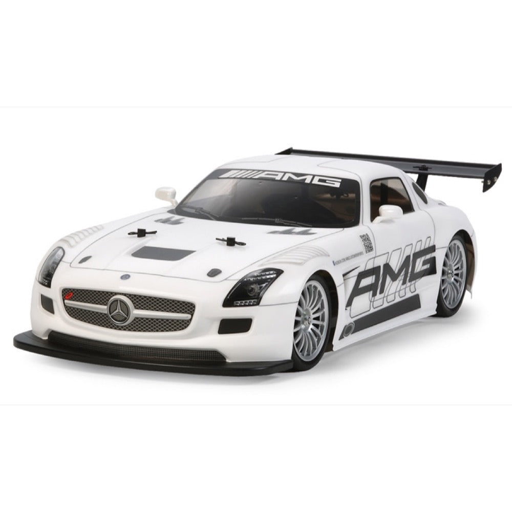 This is a R/C model assembly kit of the SLS AMG GT3, a racecar version of the September 2009-release Mercedes-Benz SLS AMG which is supplied to racing teams around the world. The polycarbonate body captures the SLS AMG GT3's aluminum long-nose, short-deck form. Side mirrors and the large rear wing are depicted using separate parts, while the livery with the AMG logo on a Flat White background recreates that used by Mercedes-Benz for promotional purposes. The kit includes stickers to recreate AMG logo and other markings. 16-spoke wheels with racing tires give the model a racy finish.