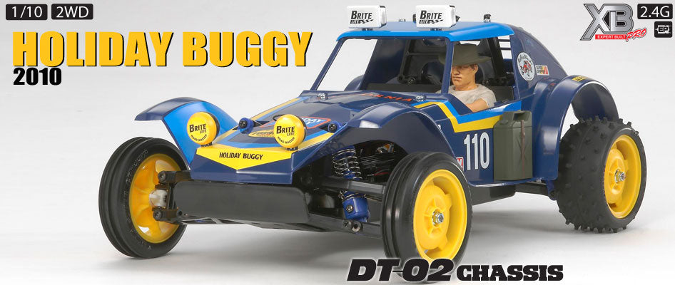 This is a factory finished R/C model which brings fully up to date the Holiday Buggy, a popular buggy model from the Tamiya 1980s line-up. Whether on the road or the dirt, the 2WD Holiday Buggy provides excellent maneuverability and it features a durable pre-painted resin body with driver figure. The DT-02 chassis features 4-wheel double wishbone suspension and is fitted with bright yellow wheels, and propelled by a powerful Type 540 motor. Front rib and rear spike tires provides buckets of grip.