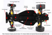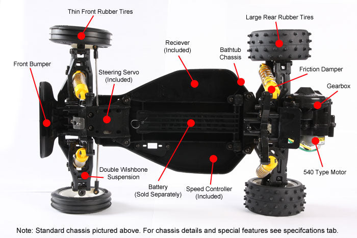 The bathtub type frame chassis features a longitudinal battery layout for lower center of gravity and optimum weight distribution. 4-wheel double wishbone suspension is equipped with coil spring damped units to provide superb off-road traction, while the chassis features a flat underside to enable thrilling skids. A sealed gearbox protects against dust and debris and is equipped with differential gears to ensure smooth cornering.