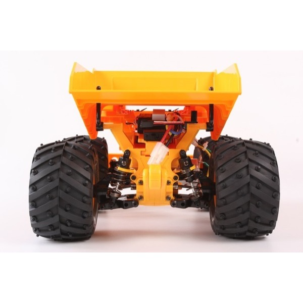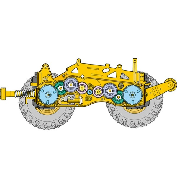 This gear-driven 4WD chassis is based around a lightweight and tough monocoque frame, with power provided by the centrally-positioned motor. It utilizes a 'square' setup with similar tread and wheelbase lengths. Sealed gearbox is integrated into the frame and protects from dust and debris, while the built-in front and rear differential gears provide smooth cornering. This is reinforced by 4-wheel double wishbone suspension and friction dampers plus a 2-piece tie rod steering setup with the servo on the left for excellent response. Furthermore, it has wheels molded in yellow to match the chassis, fitted with big 115mm diameter tires, in addition to a rear support bar with roller to prevent the model from flipping.