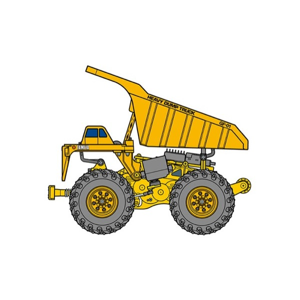 Dump trucks earn their living in some of the toughest workplaces around: large-scale construction sites, mines and quarries to name but a few. The largest of them are known as “off-highway trucks” which cannot be driven on public roads; factory built, they are disassembled and component parts such as the chassis, cab, fenders, axles and rear bed are transported via trailer to their employer, where they are re-assembled on site. These giant vehicles can reach the height of 2-storey buildings, with tires exceeding 4 meters in diameter, engines generating over 3,500hp, and an ability to carry loads topping 300 tons. Some can even be controlled remotely for use in dangerous environments. Now, you can feel the power scaled down into realistic 1/24, with the addition of this exciting new R/C model assembly kit, with realistic yellow ABS resin molded cab and rear bed parts. The model runs on the gear-driven 4WD of the GF-01 chassis.