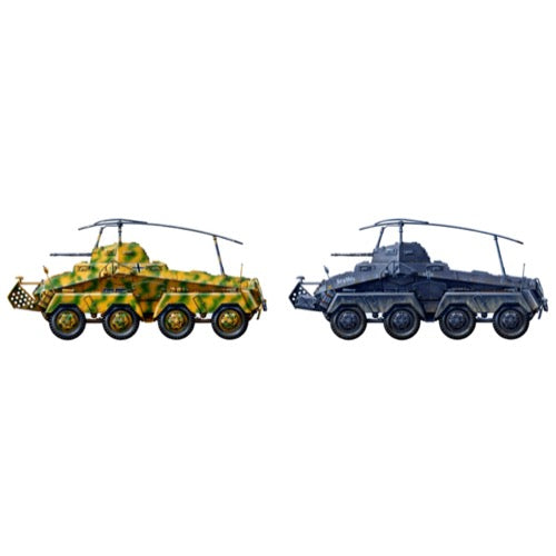 During the first half of WWII, German reconnaissance units greatly used the Sd.Kfz.231 series Heavy Armored Car. Above all, the Sd.Kfz.232 was equipped with a long distance wireless radio also having a unique large-sized frame antenna. It also came armed with a 2cm main gun and a MG34 machine gun mounted on its turret. The 8-wheeled Sk.Kfz.232 had an on-road top speed of 90km/h, featured elaborate front and rear driving positions, and a superb 8-wheel drive system. Because of the Sd.Kfz.232's excellent design and maneuverability, it came in very handy serving as the eyes of the German Army throughout Europe, Russia, and especially showed its full potential in the vast North African deserts.