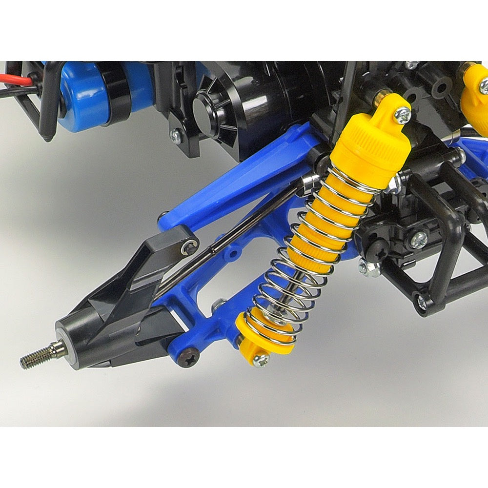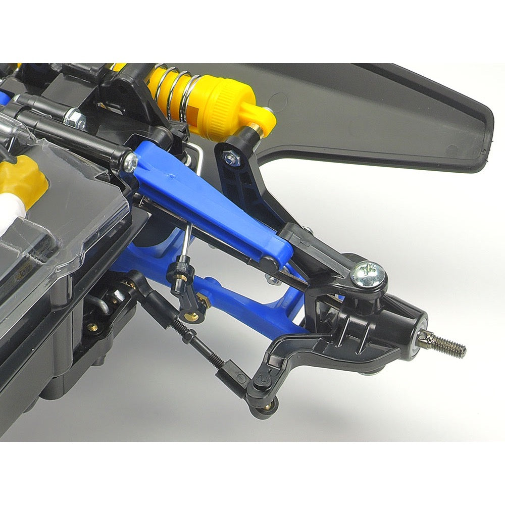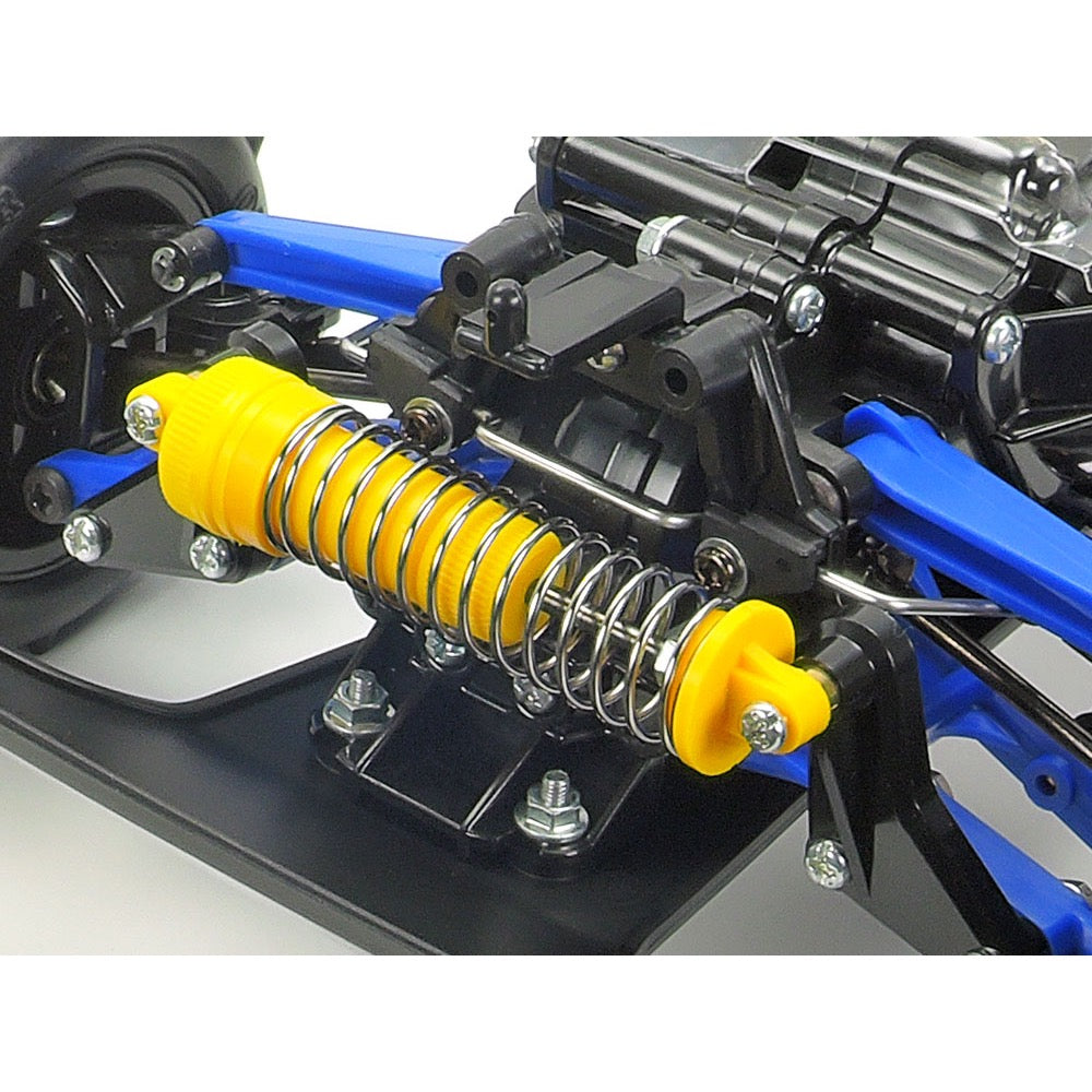 The midship motor, shaft-driven 4WD chassis is based around a lightweight and tough monocoque, with 4-wheel independent double wishbone suspension attached to gearboxes: an easy maintenance layout using upper "I" and lower "H" arms. Dual CVA oil dampers at the rear and a single one in the front monoshock setup are joined by a front stabilizer for optimal flex. Gear differential units front and rear are in sealed gearboxes, and an aluminum motor mount further improves reliability.