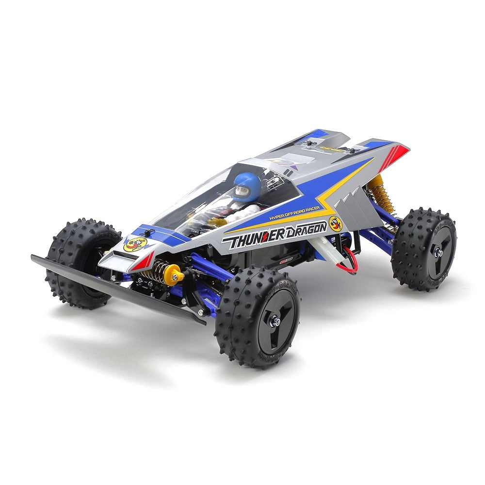 This assembly kit creates an updated re-release version of the classic R/C off-road buggy Thunder Dragon, which appeared in a Japanese cartoon in the 1980s. Its ABS bathtub frame is tough and allows easy maintenance, while 4-wheel double wishbone suspension uses CVA oil dampers and a front stabilizer for a superior ride. Sealed gearboxes front and rear contain differentials with die-cast 3-bevel types for smooth, superior handling feel, and semi-pneumatic spike tires give great grip. The streamlined body is molded in polycarbonate, with non-canopy sections painted in silver. It is pre-cut for convenience.