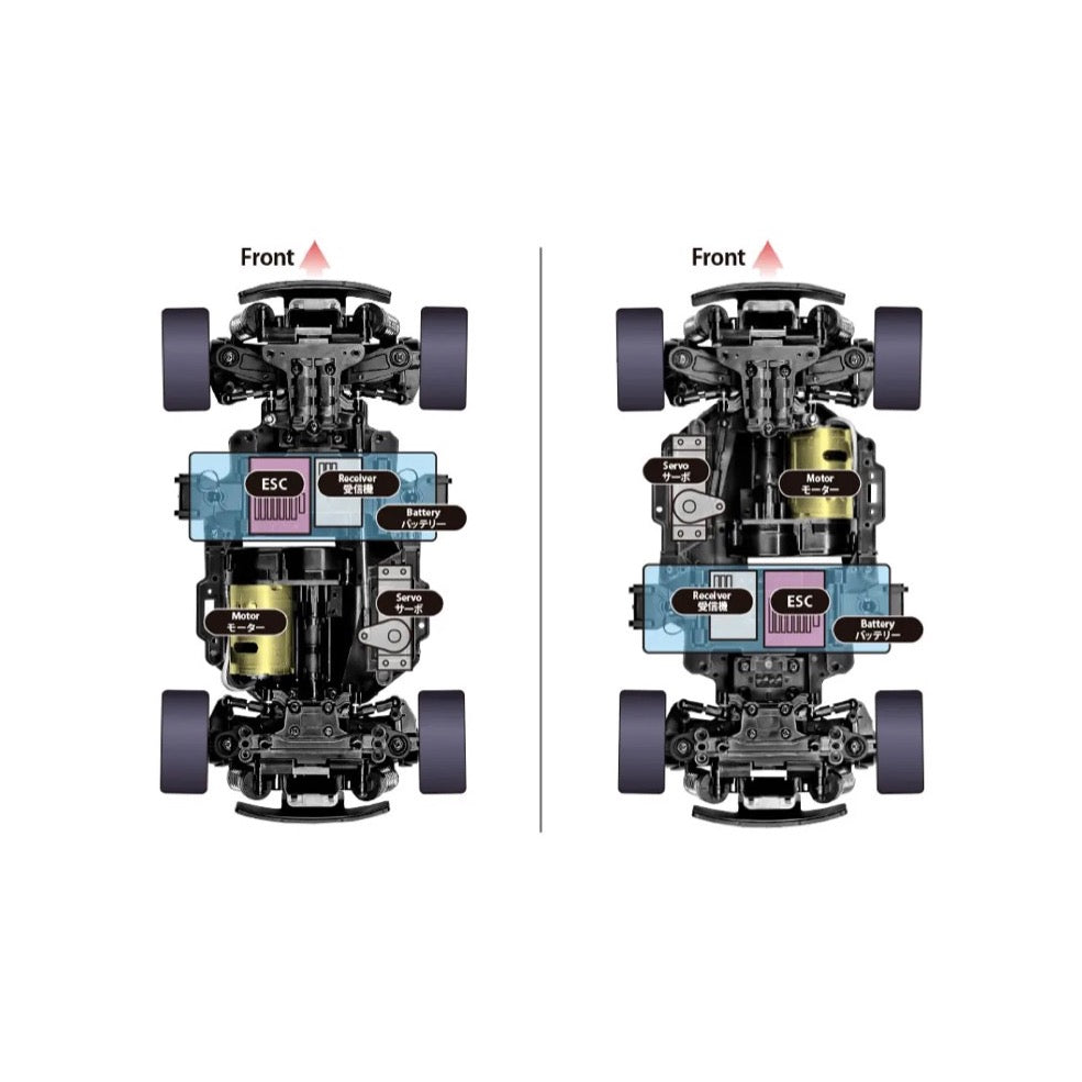 The compact, 2WD MB-01 chassis gives a choice of three types of wheelbases, and front- or rear- wheel drive system. Without removing battery pack, motor, and R/C equipment setups from the center frame, simply change attachment directions of final gears and steering linkage to switch between front- and rear-wheel drive; low or high motor position can be chosen for rear-wheel drive cars. The 4-wheel double wishbone suspension features symmetrical structure and friction dampers. Unitized sections such as motor mount, final gears and suspension facilitate ease of assembly and effective maintenance.