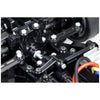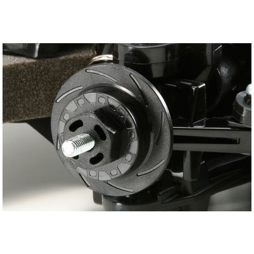 The shaft-driven 4WD TT-02 chassis employs a longitudinal layout with the battery on the left and the motor on the right, to offer excellent stability. In addition, it features identical left and right suspension arms and uprights for ease of assembly, plus easy-to-maintain gearboxes. It is a highly adaptable chassis, as it offers 2 different wheelbases, 2 ground clearance settings and 2 tread set-ups in addition to a range of 10 possible gear ratios. It is not short on looks either, with brake disc-shaped wheel hubs and stylish front bumper supports.
