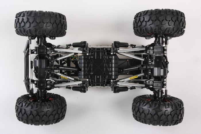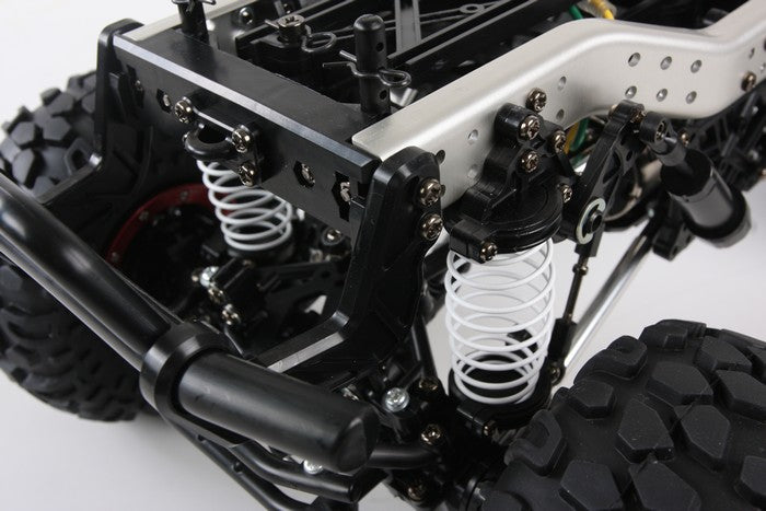 The body of the car is based upon a Tamiya classic, the Stadium Blitzer, which has been modified, featuring an updated color scheme and brand new marking stickers. The shaft driven chassis features a compact planetary gearbox which transfers power to the wheels, and is small enough to enable a lower center of gravity. The CR-01 chassis supreme climbing ability stems from the rigid 4-link suspension with front/rear stabilizers. It is fitted with push rod-actuated oil dampers, with coil springs to act as tension springs. Front and rear 3-bevel differentials are lockable to provide even better traction off-road.