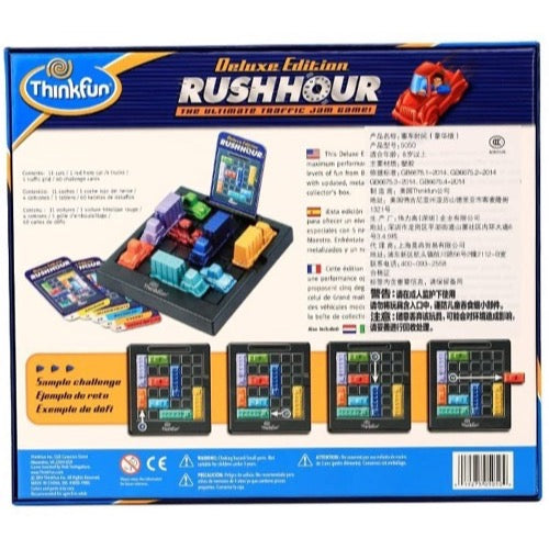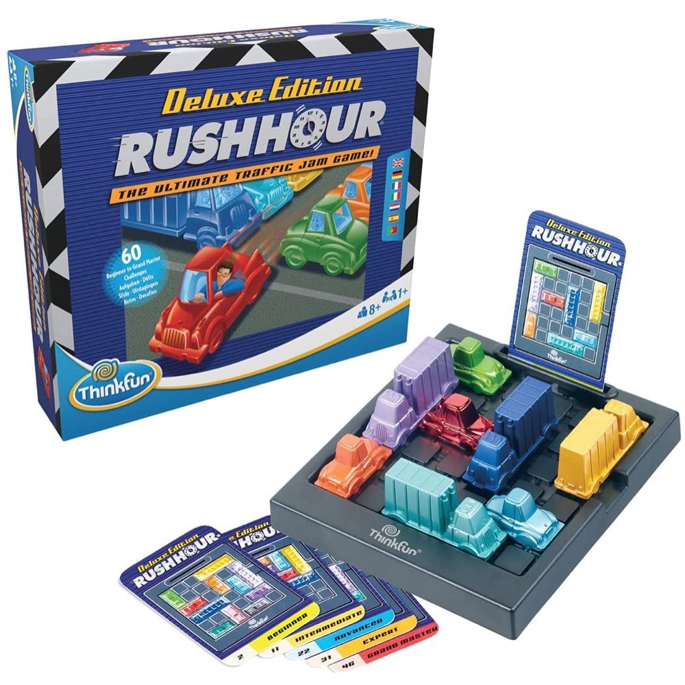 Players tackle five levels of challenge as they progress through 60 challenges from Beginner to Grand Master. Rush Hour fans will enjoy the metallic car design and attractive storage box. Instructions are conveniently printed on the inside of the box lid. This deluxe edition of your favorite game is the ideal gift for the Rush Hour addict.