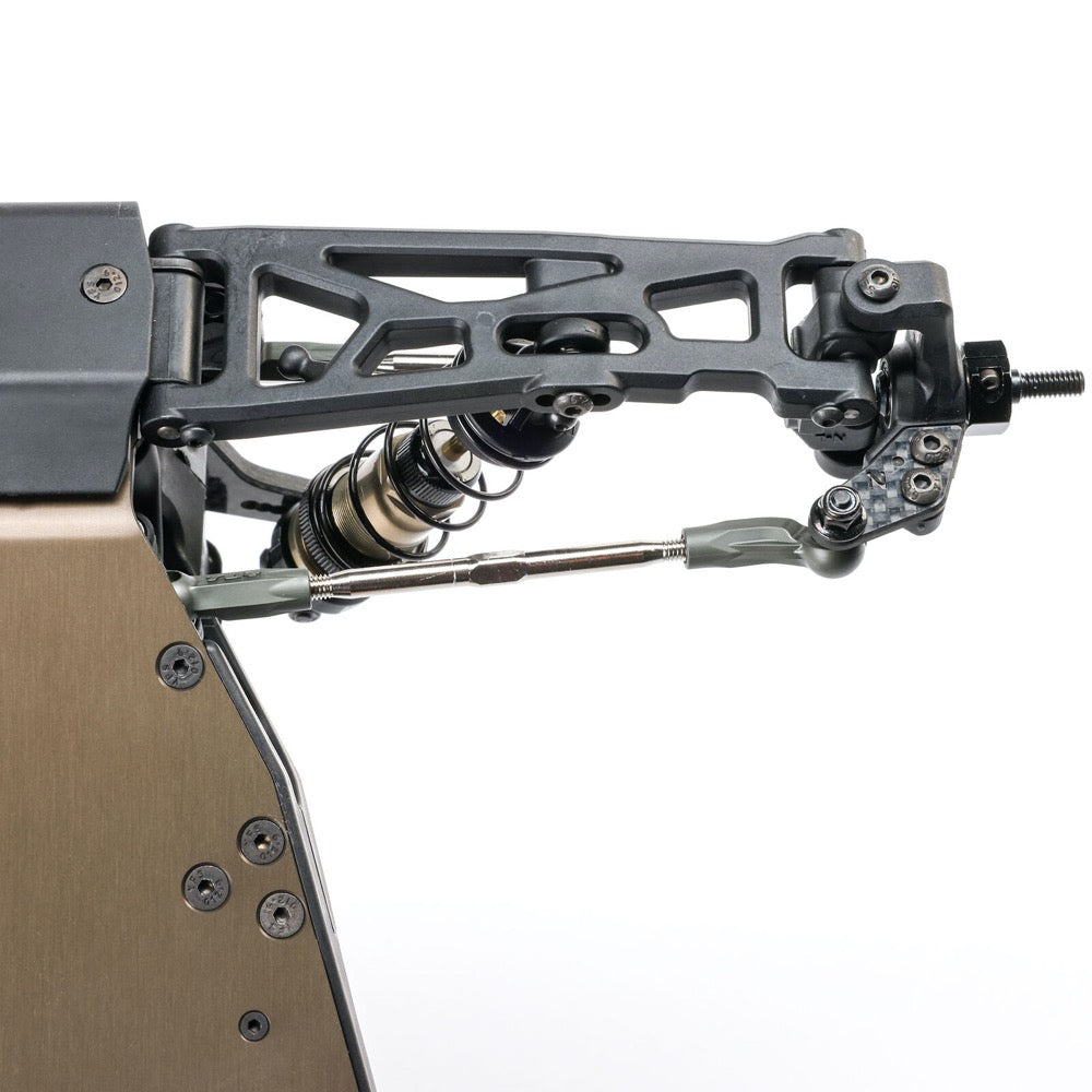 The 4mm front and rear shock towers are made of woven carbon fiber for rigidity and durability. The front tower anchors to the front bulkhead to reduce flex and increase bulkhead strength. The rear tower location allows for more wing adjustment, and for the rear diff to be removed without removing the gear box.