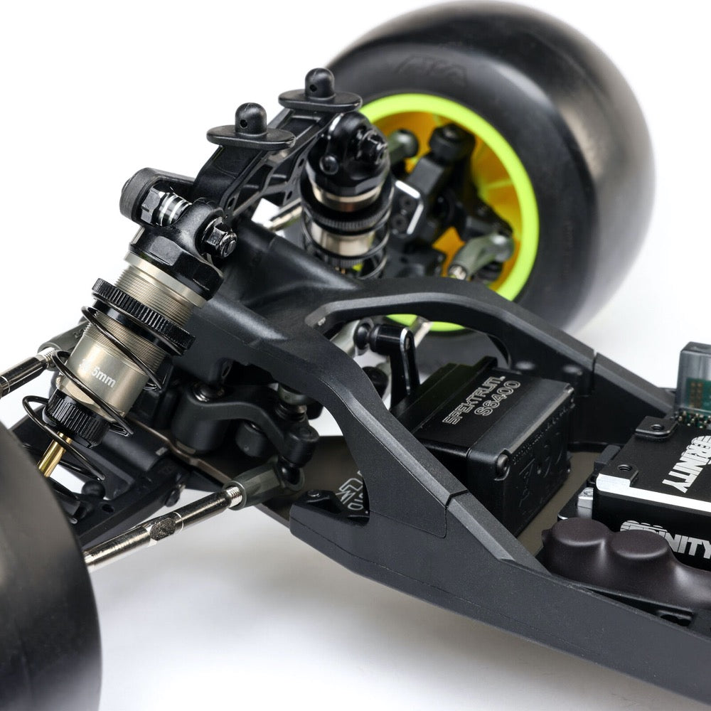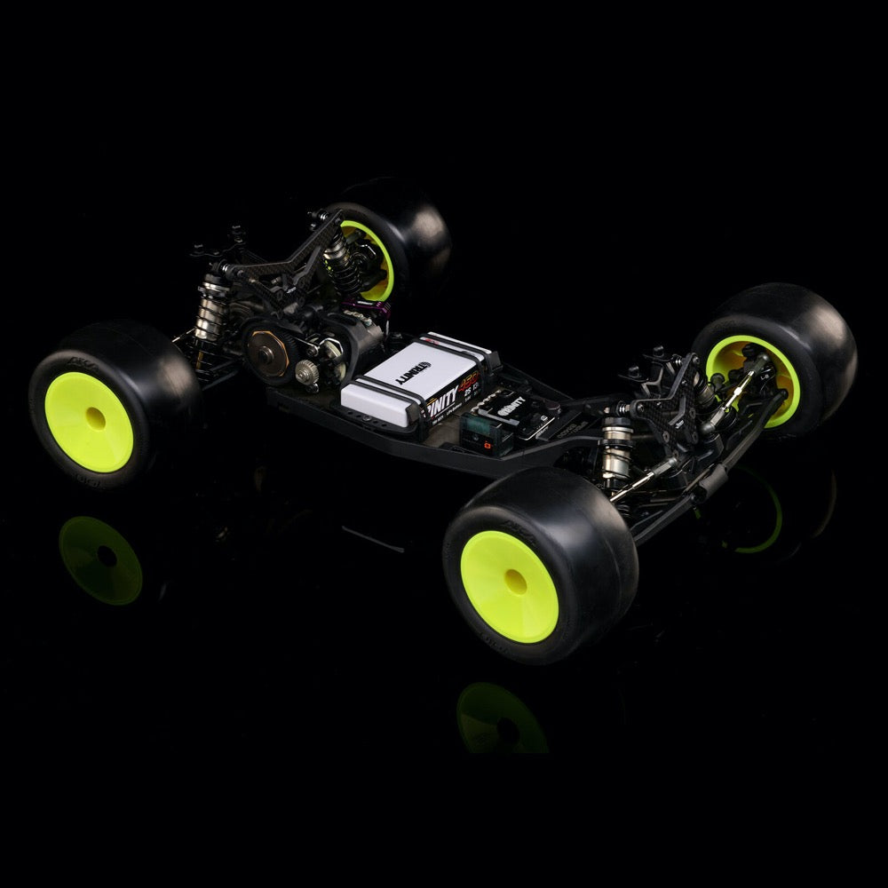 If you're ready for the podium, the 22X-T is equipped to take you there. Key improvements include a hard-anodized 2mm 7075-T6 aluminum chassis that's lengthened and optimized for today's higher grip tracks, plus adjustable body mounts and all-new front and rear arms. The buggy-length shocks and lower towers produce a lower CG, while larger, 13mm big-bore shocks with 13mm springs contribute to plush landings and quick cornering.