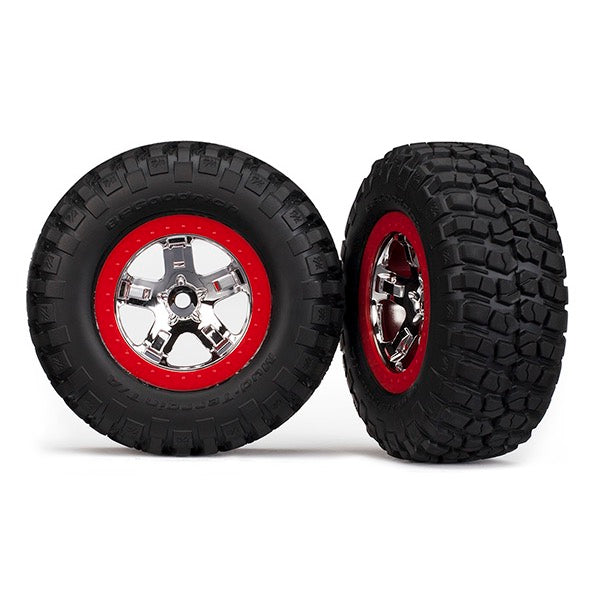 Pair of BFGoodrich® Mud-Terrain™ T/A® KM2 tires come pre-glued and mounted with foam inserts to chrome SCT wheels with red beadlock-style trim. Fits 12 mm hex, 2WD front only.