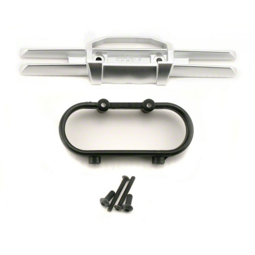 Traxxas rear bumper and mount for the Revo. The plastic bumper is silver in color.  TRX" logo in the center of the bumper.  Body mount is black in color.  Includes: One rear bumper. One bumper mount. (2) 4X10mm button head screws. (2) 3X26mm button head screws