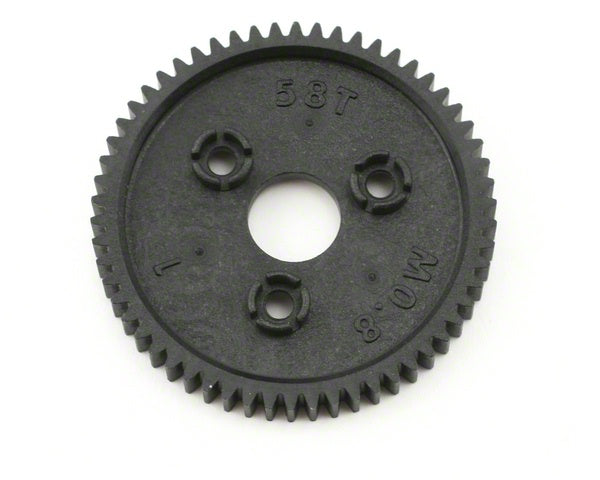 This is an optional 58T (0.8 Metric Pitch) spur gear from Traxxas. This gear mounts to the input shaft of the transmission, and meshes with the pinion gear on the clutch bell.