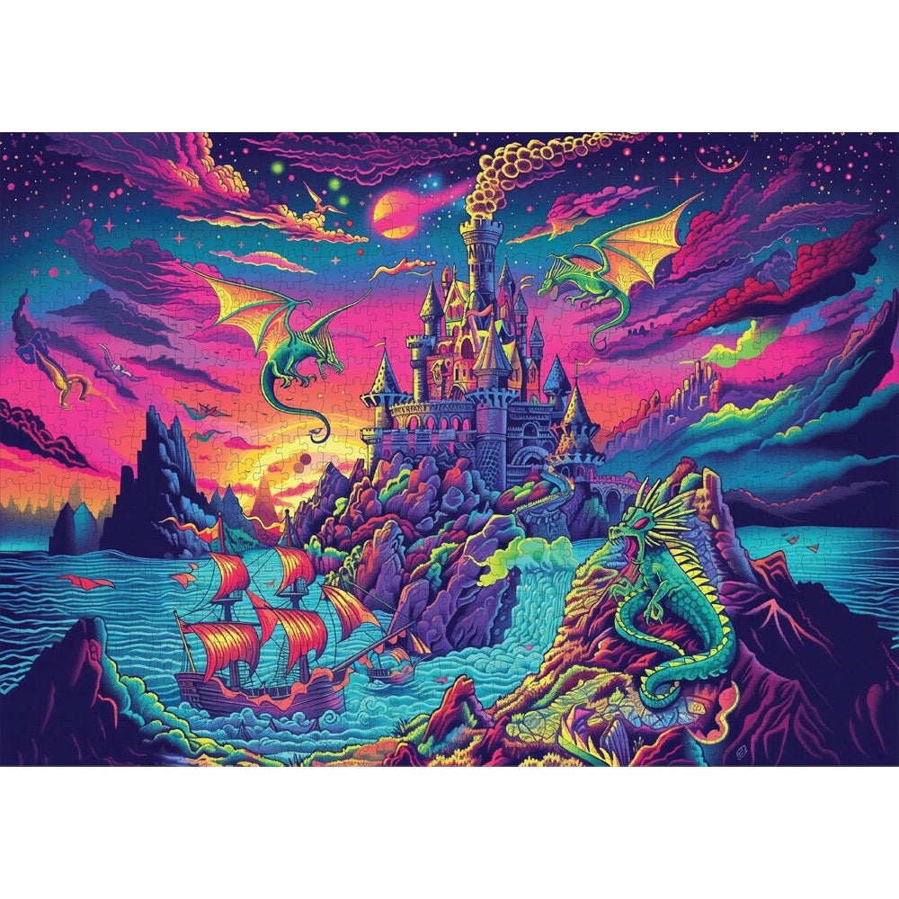 Enter a world of dragons, castles, and pirate ships with the Dragons Dream 1000-piece jigsaw puzzle. This intricate puzzle brings to life a vibrant fantasy scene featuring majestic dragons soaring above a castle, while pirate ships sail across the surrounding waters. Designed for adults and families, this puzzle offers an immersive challenge that engages your creativity and sharpens your mind.