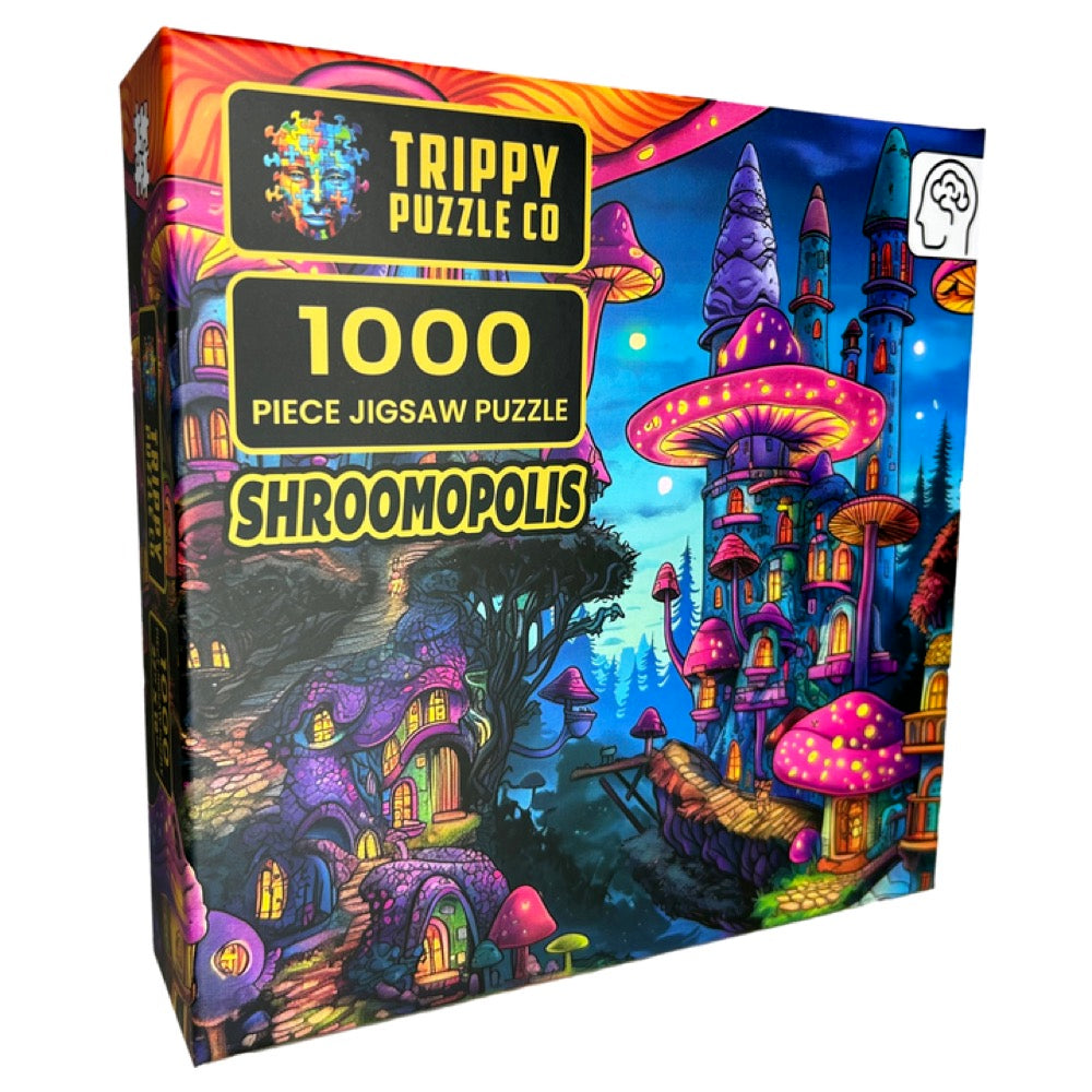 Embark on a whimsical adventure with the Shroomopolis 1000-piece jigsaw puzzle, featuring a fantastical village made entirely of colorful, trippy mushrooms. Perfect for adults and families, this puzzle offers a delightful challenge with captivating artwork and vibrant details.