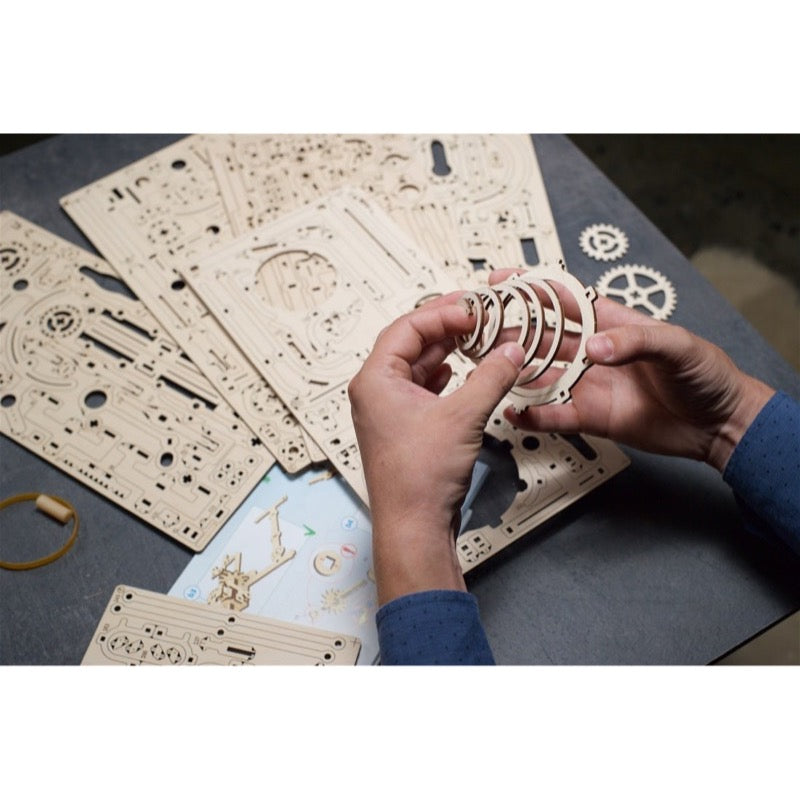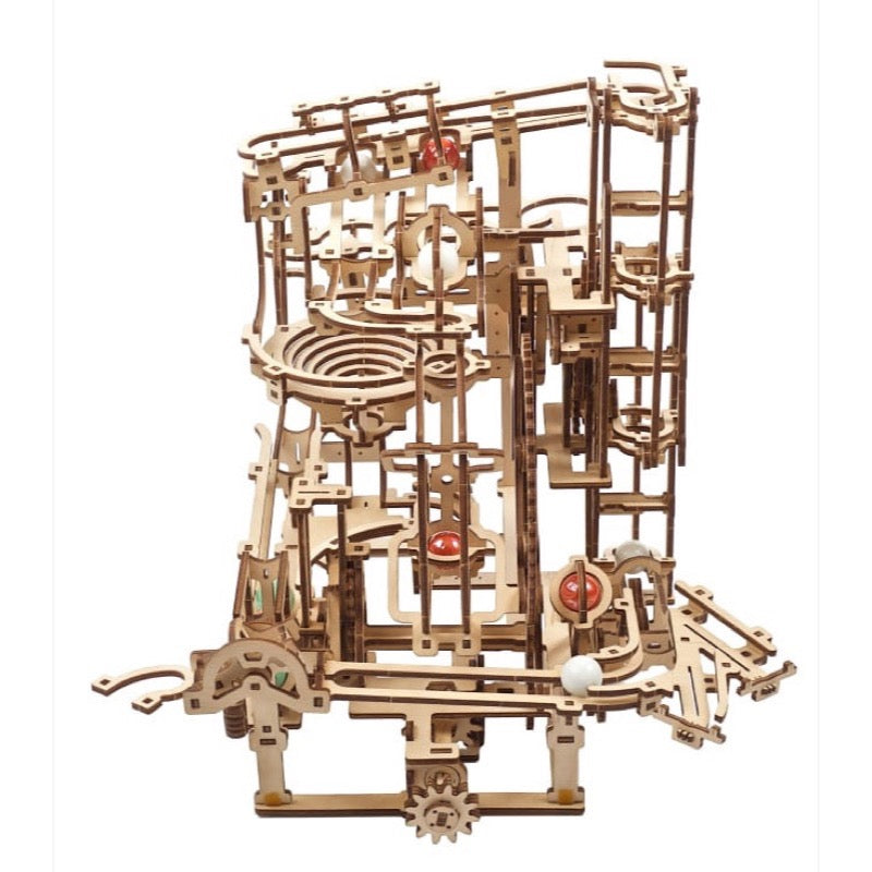 You and your family will have hours of fun constructing this DIY kit together, without need of glue or special tools. And with Ugears, the fun doesn't stop with the build. When you build a Ugears marble run the fun is just beginning! You, your family and friends will have hours of enjoyment watching this ingenious machine send marbles through a serpentine course, swirling down a funnel, or flipping upside down in a hammer swing. Like all our models, brain teasers, and 3D puzzles, the Ugears Marble Run Stepped Hoist is a beautiful standalone, or it can form part of a growing collection of marble runs or other elegant, functional wooden mechanical models.