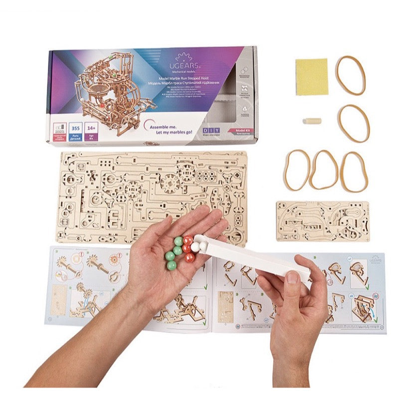 Experience the satisfaction of building your own intriguing, 3D puzzle / kinetic sculpture / marble run from Ugears. Everything you need for this fun DIY project comes right in the box, including pre-cut wooden boards, 10 marbles, plus wax and sandpaper (for optimal gear function). Each Ugears model kit, 3D puzzle, or brain teaser comes with a set of detailed, illustrated instructions in 11 languages. The Marble Run Stepped Hoist has 355 pieces, is rated "Advanced" level, and has an estimated assembly time of 8 hours. If you break a piece during construction, don't panic! Ugears models each come with a few spare parts included. If it's a unique piece that's damaged or broken, just contact our customer service and we'll gladly send you a replacement part, free of charge.