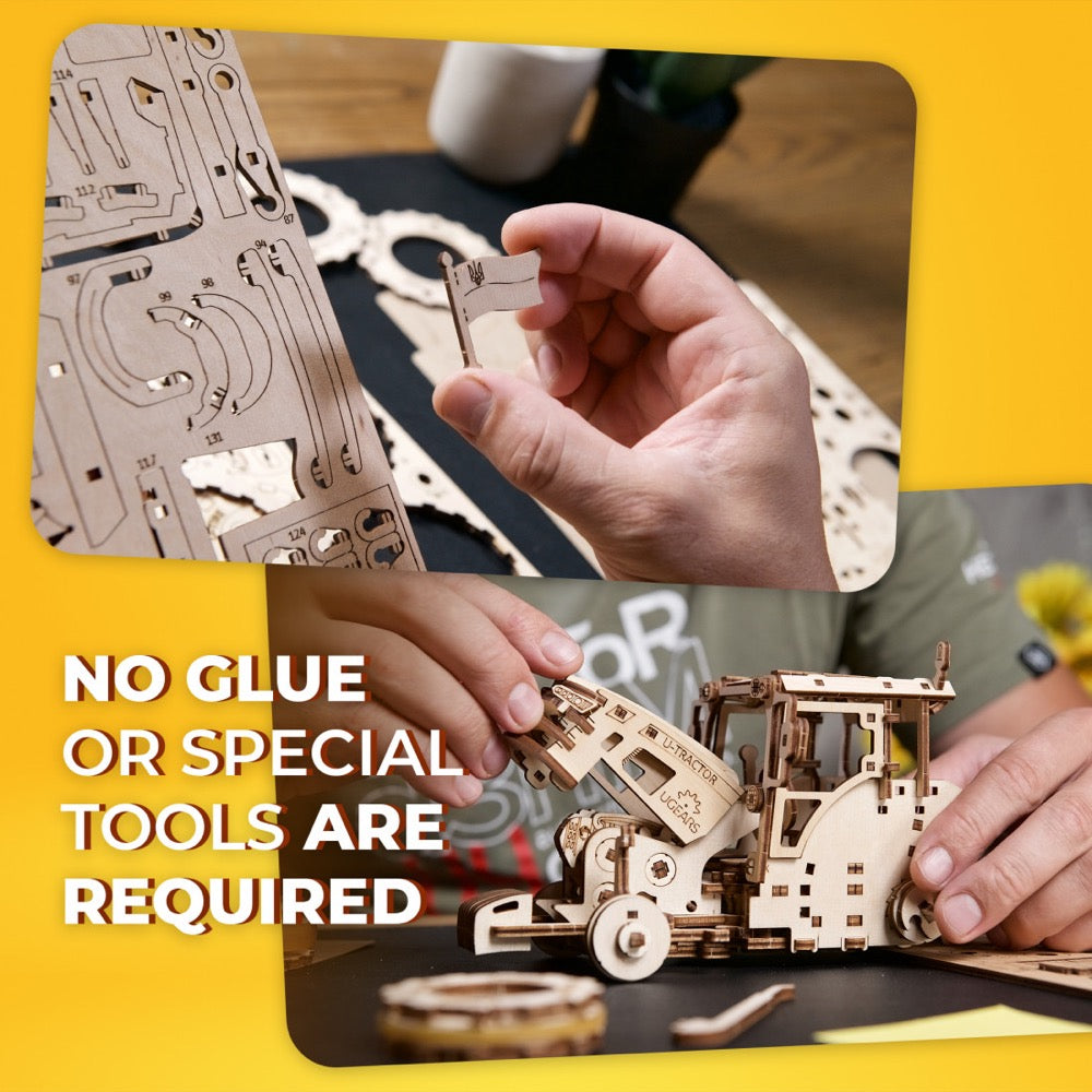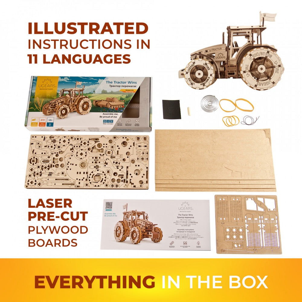 The Tractor Wins model kit has 272 parts, including wooden Tractor pieces, cardboard tank pieces, and tow string. Everything you need for assembly comes right in the kit. As with all Ugears DIY models and 3D puzzles you won't need glue or special tools, just assemble the pieces following our illustrated step-by-step instructions in 11 languages (English, Ukrainian, German, Spanish, French, Italian, Portuguese, Polish, Japanese, Chinese, and Korean). The Tractor Wins is an Intermediate level model, so good for those with a bit of modeling experience, and promises approximately 7 hours of enjoyable assembly time. You'll have many more hours of enjoyable playtime as you reenact for your friends and family, grandchildren, nieces and nephews, or neighborhood children, the story of brave Ukrainian farmers getting the better of a superpower's professional military.