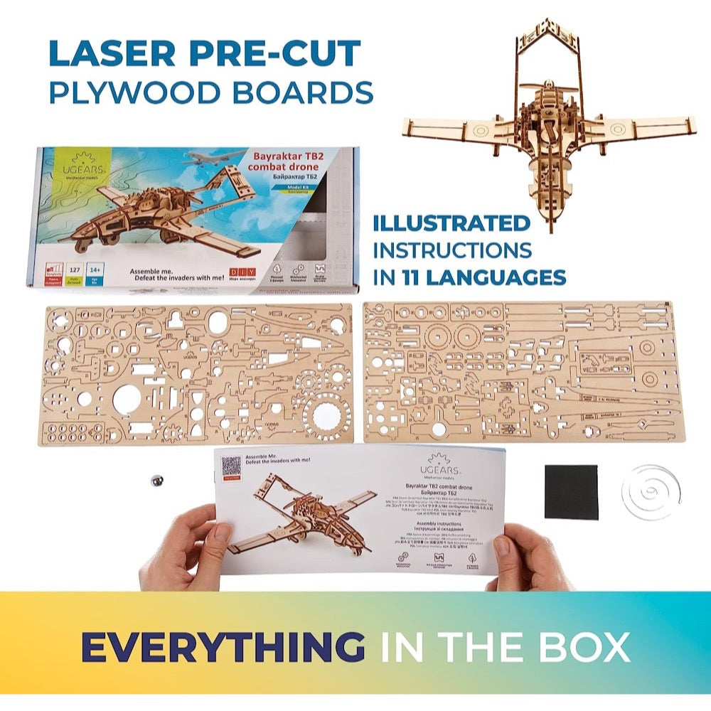 The Bayraktar TB2 combat drone is an integral part of Ugears new ZSU model line, created to inspire people in difficult times. Like all of Ugears' outstanding line of 3D puzzles, DIY model kits, automatons, robots, wooden puzzle boxes and STEM Lab model kits, the Bayraktar TB2 combat drone assembles without need of glue or special tools. Just punch the pieces out of the laser pre-cut boards then snap them together following our illustrated step-by-step instructions in 11 languages (English, Ukrainian, German, Spanish, French, Italian, Turkish, Polish, Japanese, Chinese, and Korean).