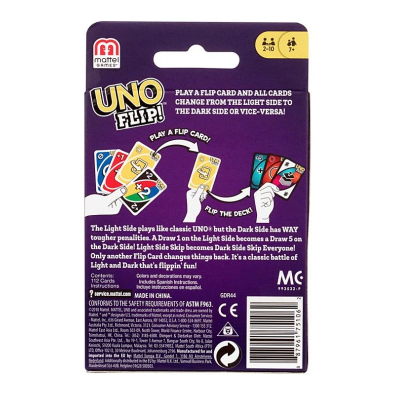 It's the matching game you know, plus exciting new twists -- like a double sided deck and special FLIP card -- that give classic gameplay a competitive edge. Players take turns matching a card in their hand with the current card shown on top of the deck either by color or number. In a race to deplete their hands, players can play special cards to slow their opponents down, like Skips, Reverses and color-changing Wild cards. UNO FLIP!™ also includes new Action cards that really shake things up, like Draw Five and Skip Everyone cards. Play the special FLIP card and all cards in your hand, the draw pile and draw deck are flipped over to reveal an entirely new set of numbers and colors on the opposite side! The holder of the FLIP card determines whether or not you play on the "light" side or "dark" side of the deck -- and when you switch it back around. Strategize to rattle your competition and be the first to get rid of your cards to win. When you're down to one card, don't forget to shout "UNO!" Colors and decorations may vary.