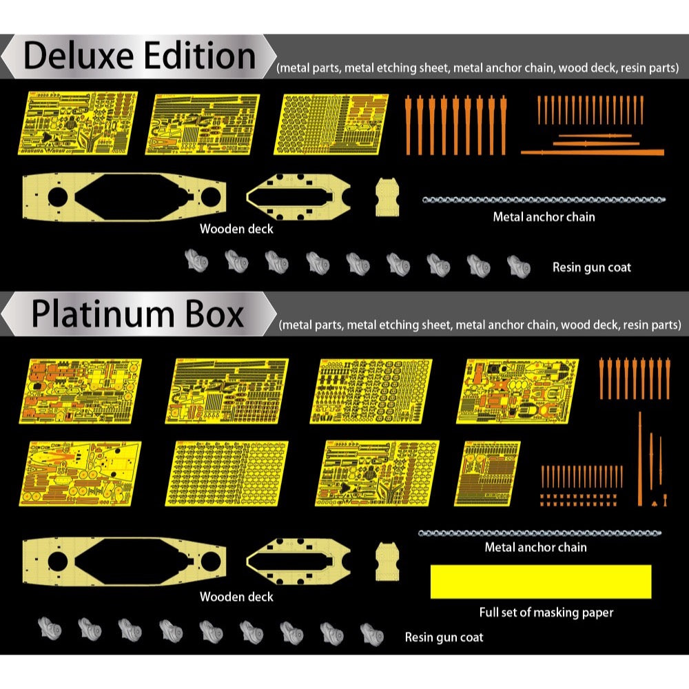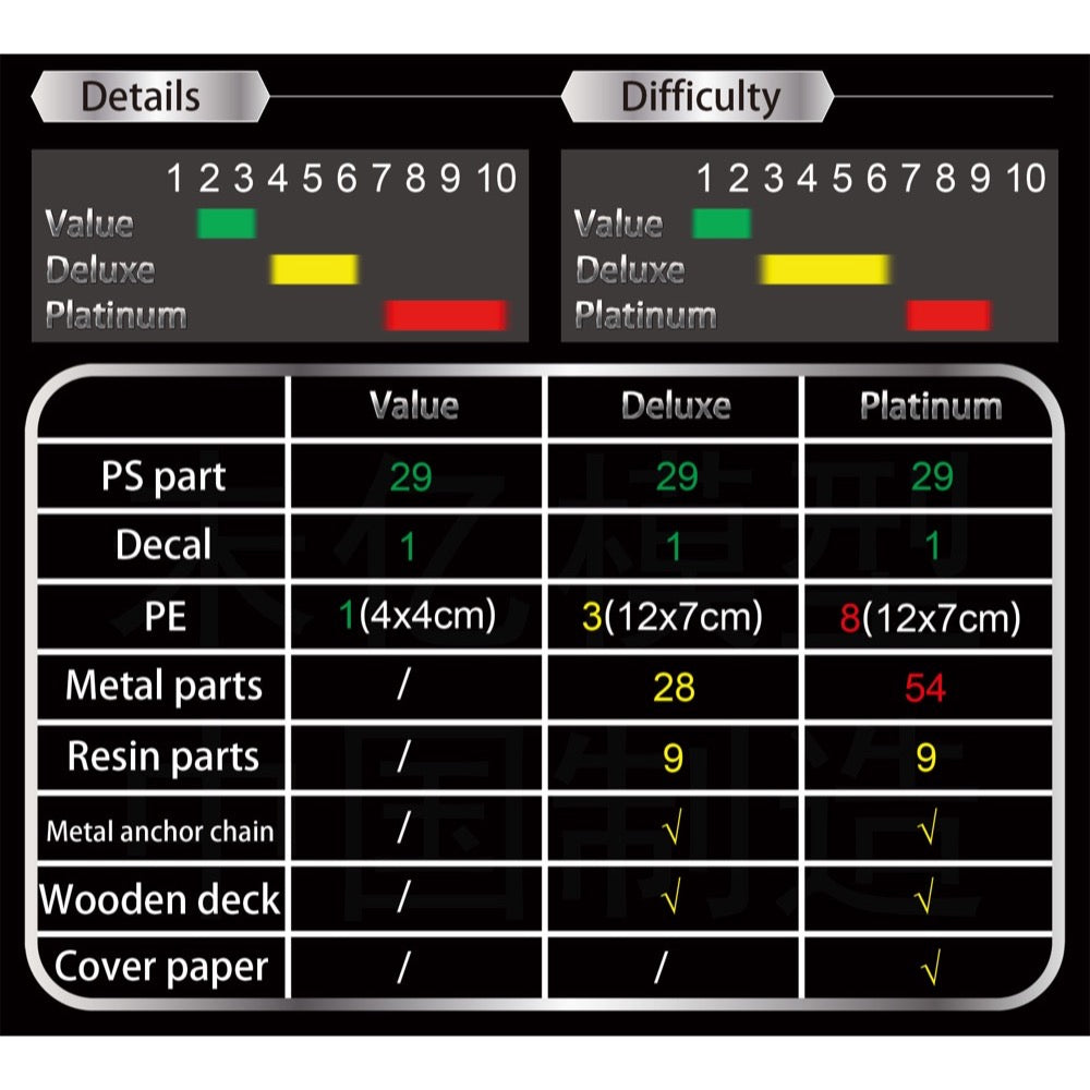 This kit comes with injection-plastic parts, decals and photo-etched parts. A wonderful kit that reproduces this iconic ship as she was seen in World War II, with plenty of delicate details