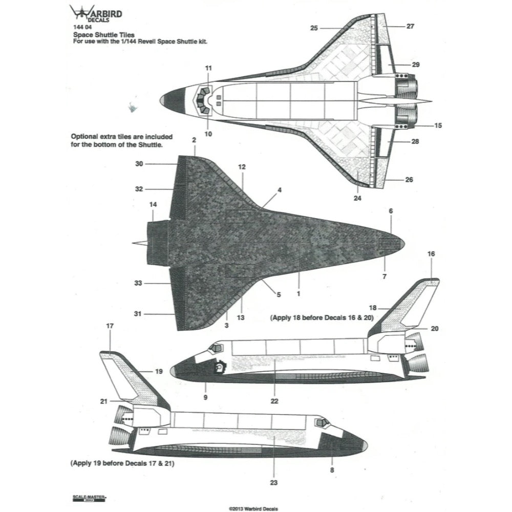 Warbird Decals 14404. Tile details for the Revell Shuttle in 1/144. Decal elements are scaled for the details that the kit already has (raised details) Excellent quality. This item is a must if your building that kit.