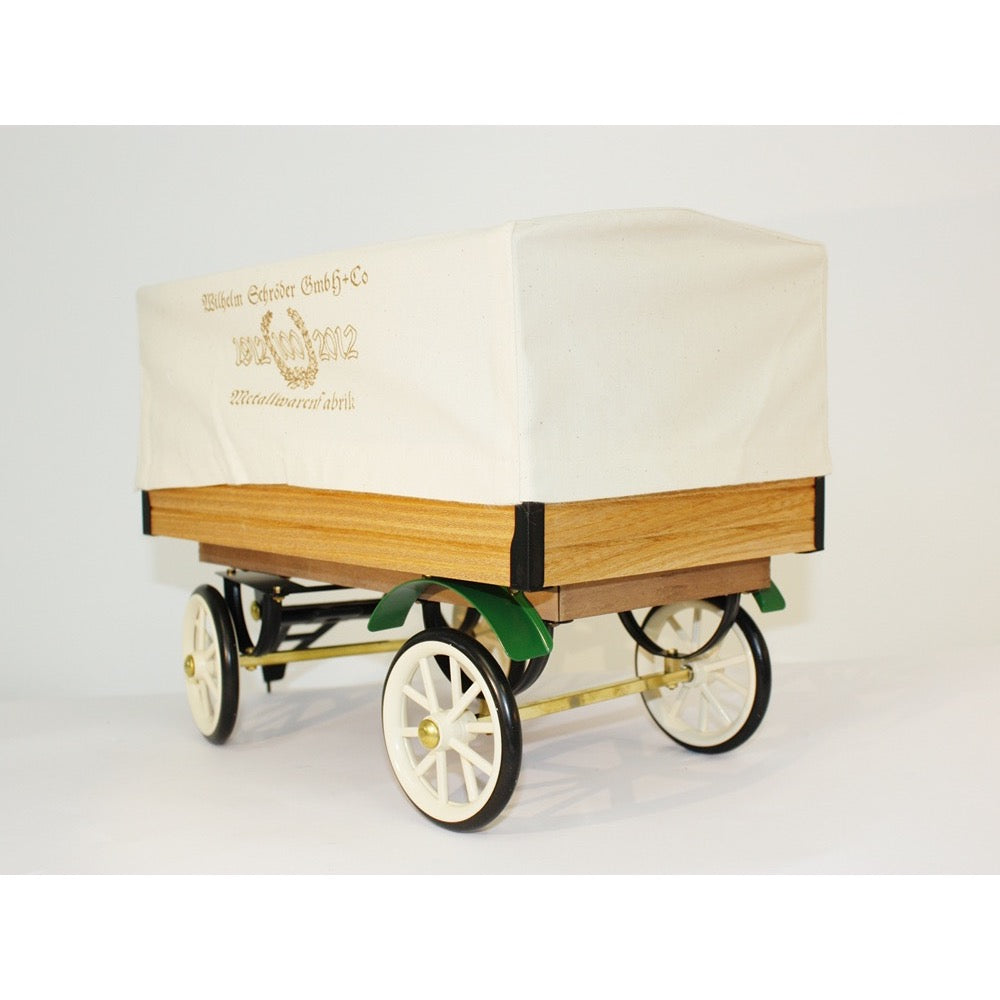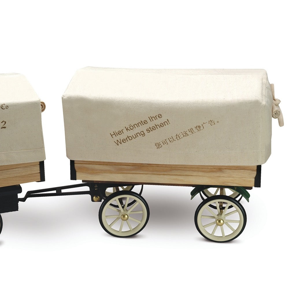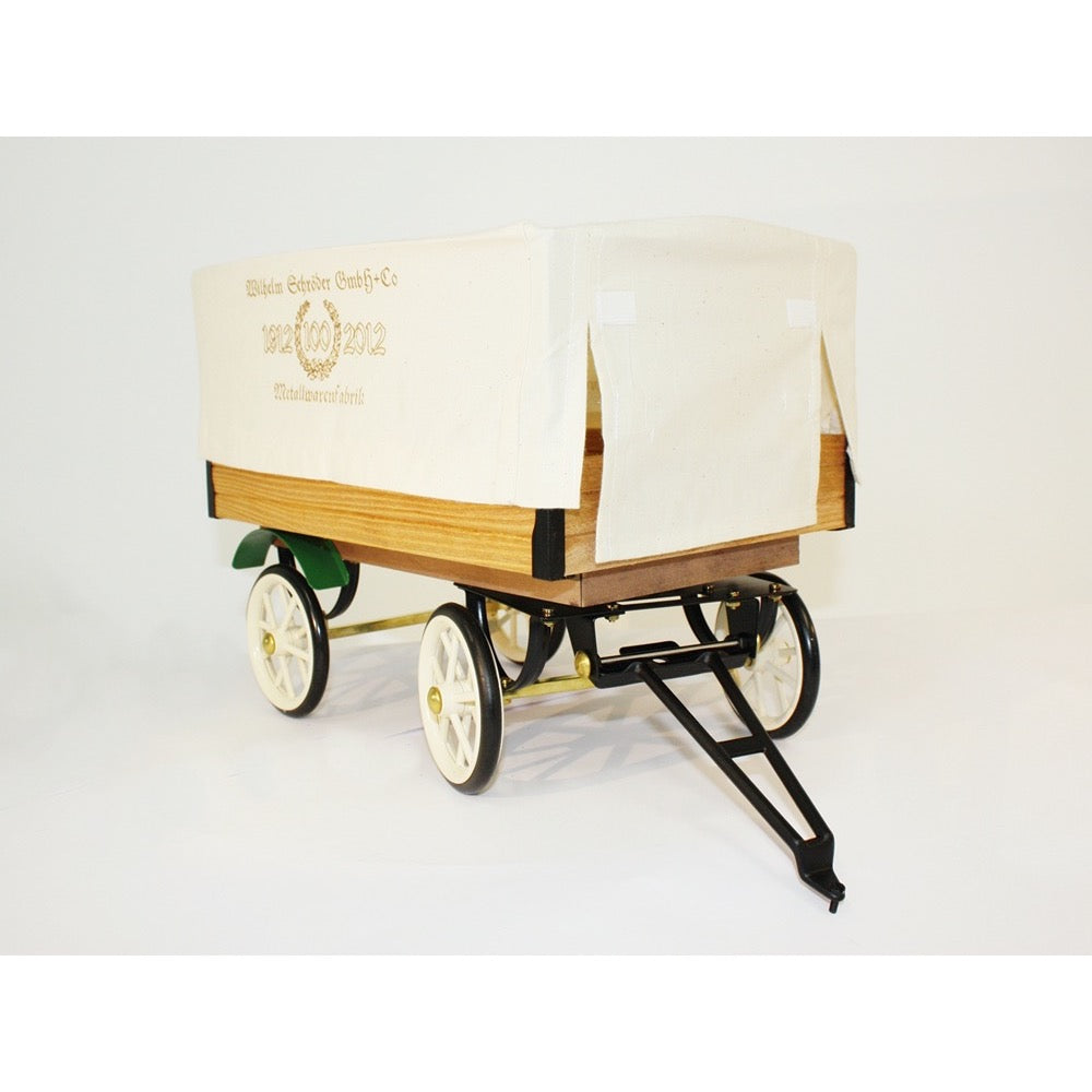 For the steam engine D320, a steam-powered truck, there is a beautiful small trailer that matches its own loading area. There is also a lightweight fabric cover to protect the load, just like for the loading area. The cover is printed with the symbol of the 100th anniversary of the Willhelm Schröder metalware factory.