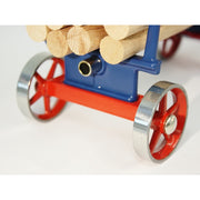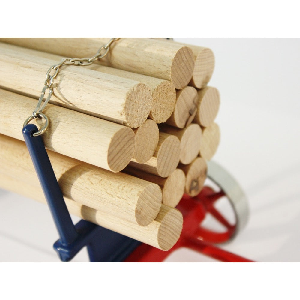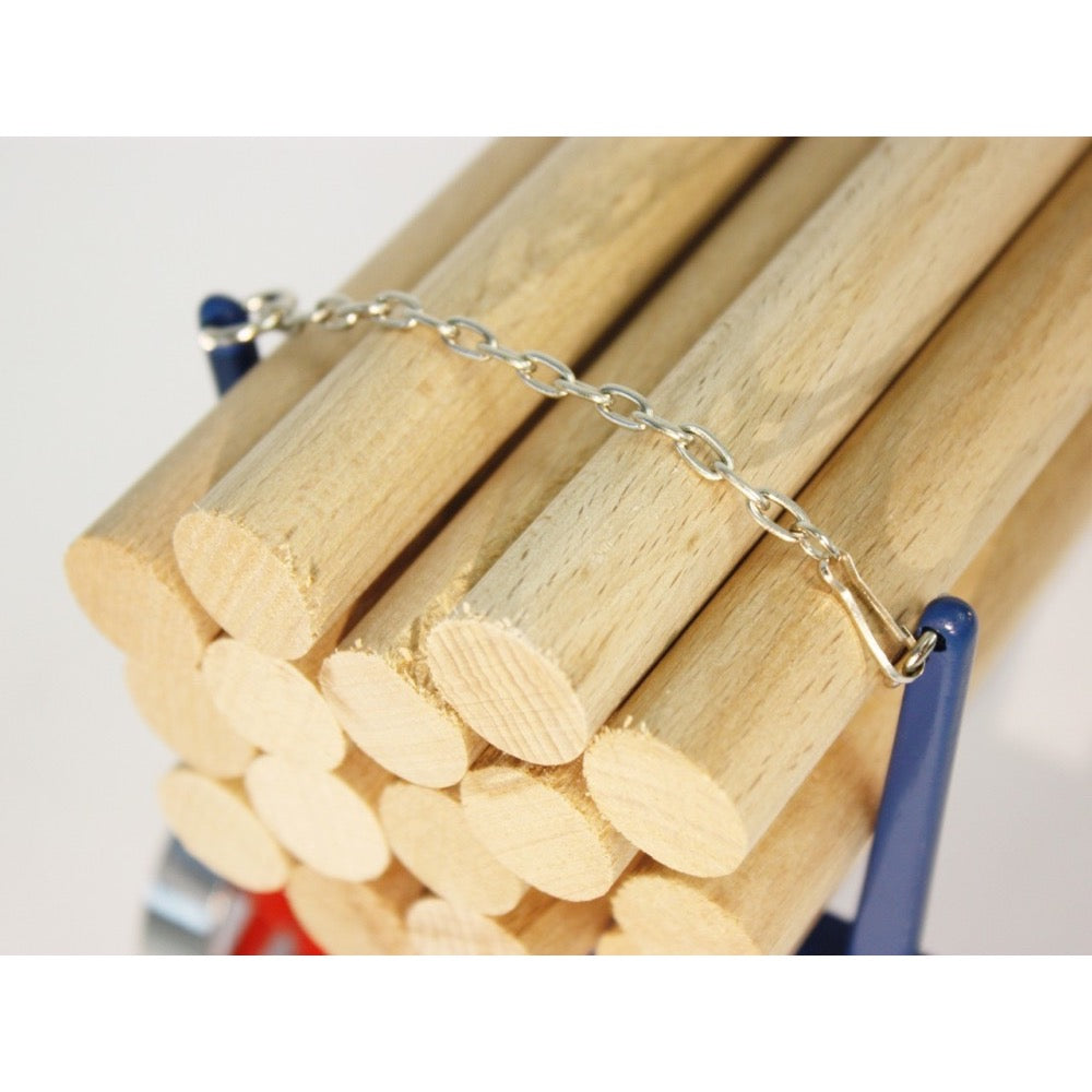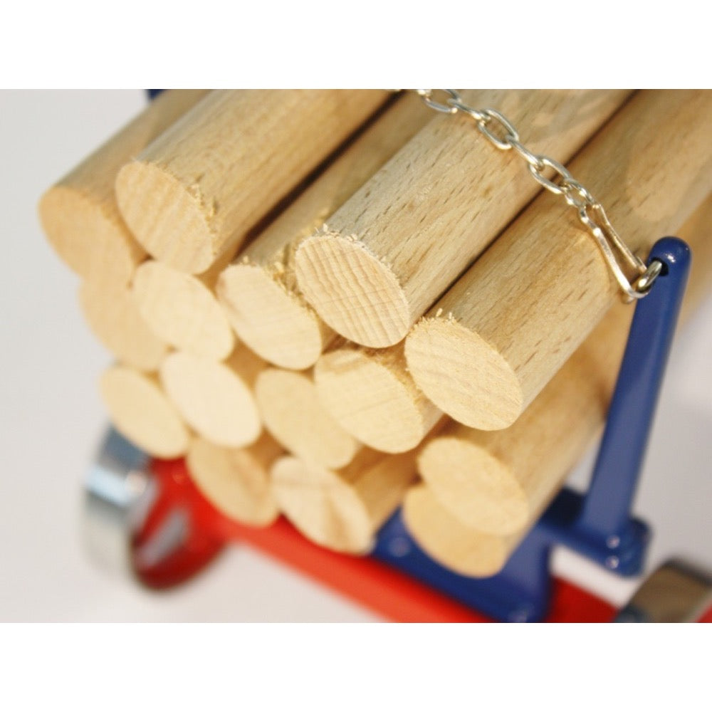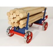 With the Wilesco Lumber wagon A425, you can perfectly complement your mobile steam engine. The spokes wheels made of zinc die-casting are lacquered and polished, ensuring high resistance and durability. Brass-plated chains with hooks provide secure fixation of the wood. The long-wood wagon offers space for 15 natural wood rods with a diameter of 16 mm and a length of 22 cm. Thanks to the hook-in coupling, the wagon can be easily attached to your mobile steam engine.