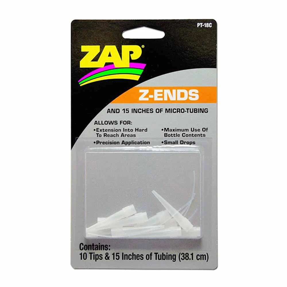 Zap Z-Ends are 10 pcs extended tips and 38 cm (15 inches) of micro dropper tubing. These fir to the end of ZAP Superglue bottles to allow smaller drops of glue to be placed accurately in hard-to-reach places. Zap Z-Ends PT18 are suitable for thin and medium weight cyano acrylate glue, and fit most CA glue bottles.